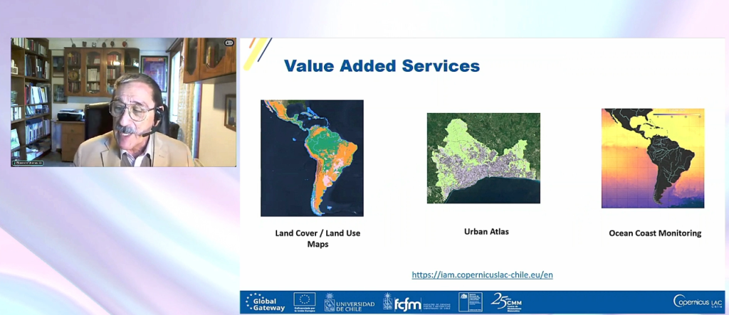 Durante su intervención, Utreras presentó la infraestructura y los servicios desarrollados por el Centro, entre ellos: Cobertura y Uso de Suelo, Atlas Urbano, Monitoreo de Costas Oceánicas (en desarrollo) y Nube Privada, destacando la importancia de la clasificación de Cobertura y Uso de Suelo (LU/LC) conforme a la norma FAO.