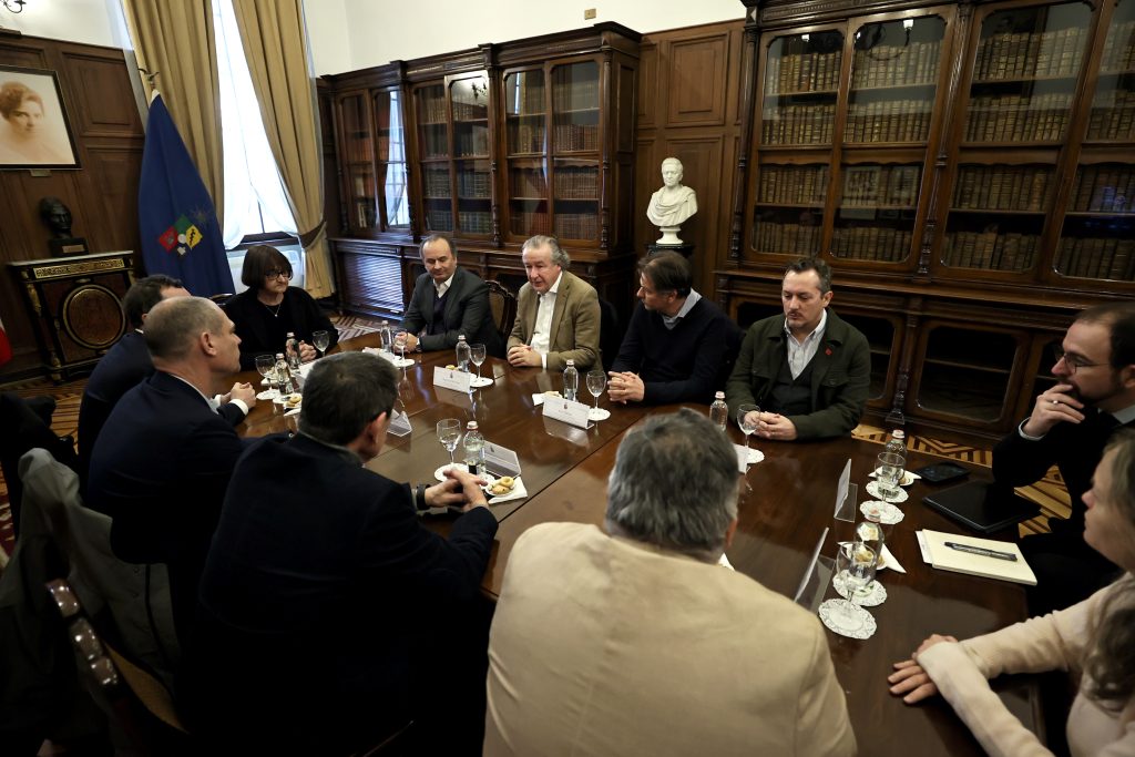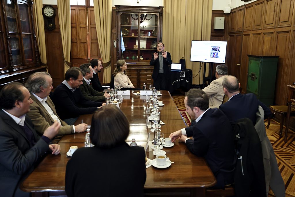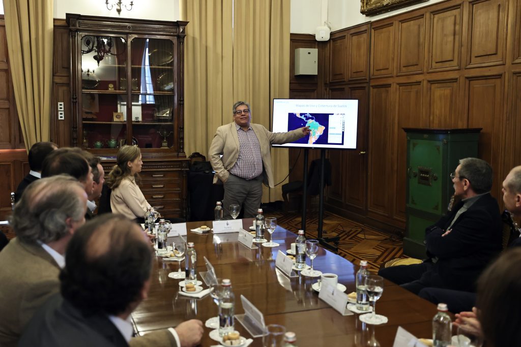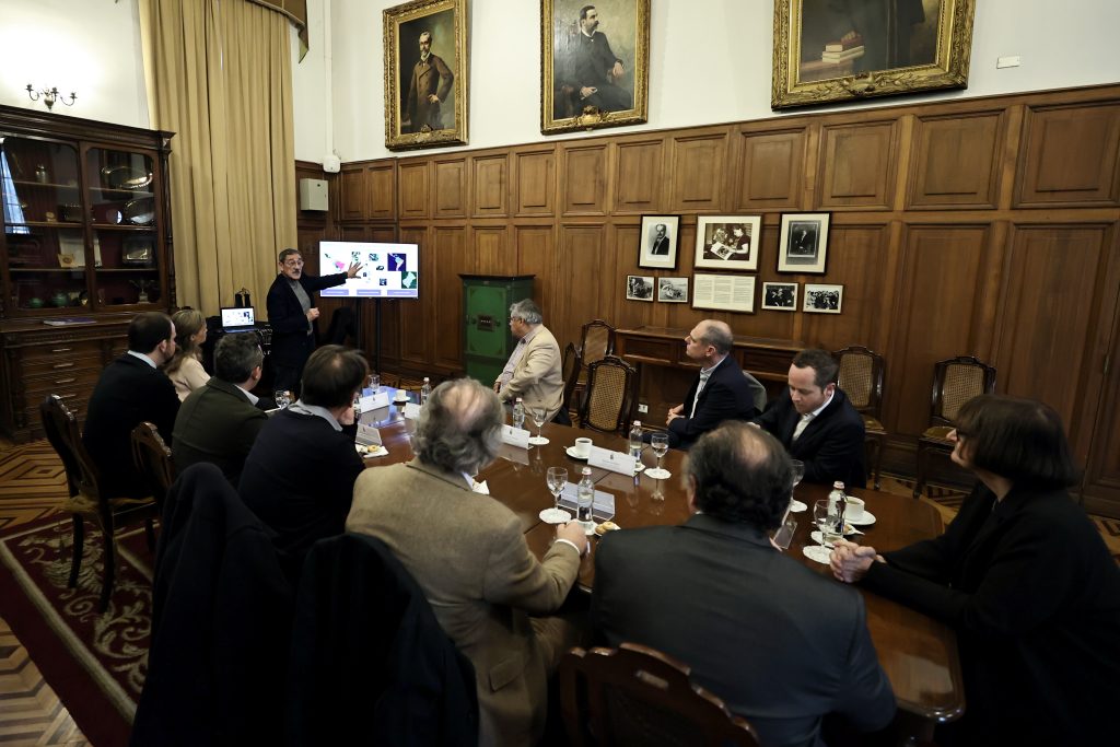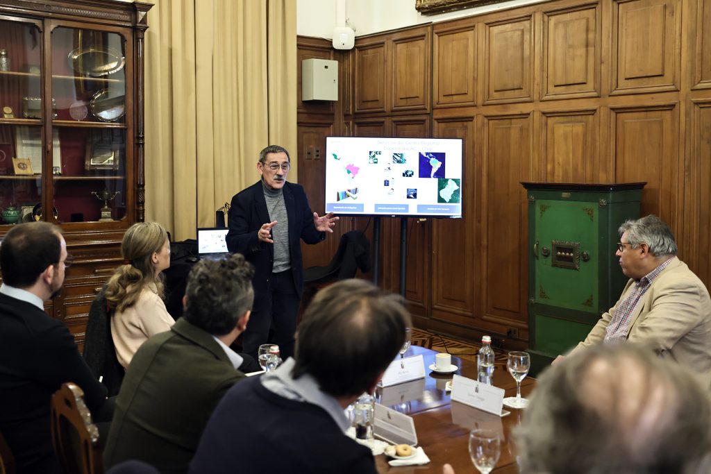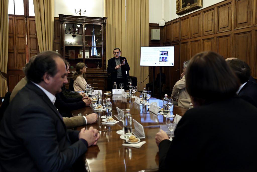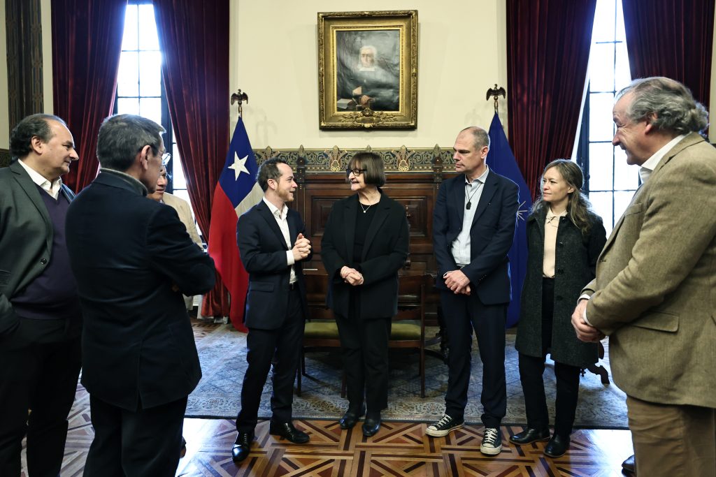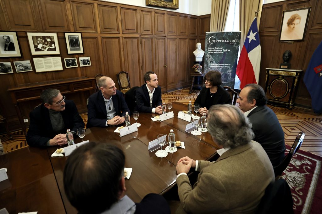 Los representantes europeos llegaron hasta Casa Central, donde fueron recibidos por la Rectora de la Universidad de Chile, Rosa Devés, quien estuvo acompañada por el decano de la Facultad de Ciencias Físicas y Matemáticas, Francisco Martínez; el director del Centro de Modelamiento Matemático (CMM), Héctor Ramírez; el director de CopernicusLAC Chile, Florencio Utreras; y el director científico de Centro, Jaime Ortega.