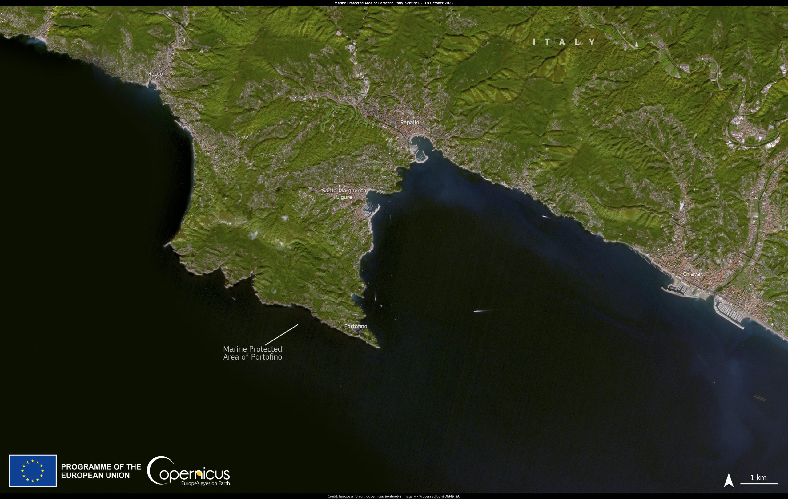 A Área Marinha Protegida de Portofino, localizada ao longo da costa da Ligúria, na região da Ligúria, norte da Itália, foi criada para salvaguardar sua extraordinária biodiversidade marinha e promover um uso sustentável de seus recursos naturais. Crédito: União Europeia, imagens do Copernicus Sentinel-2